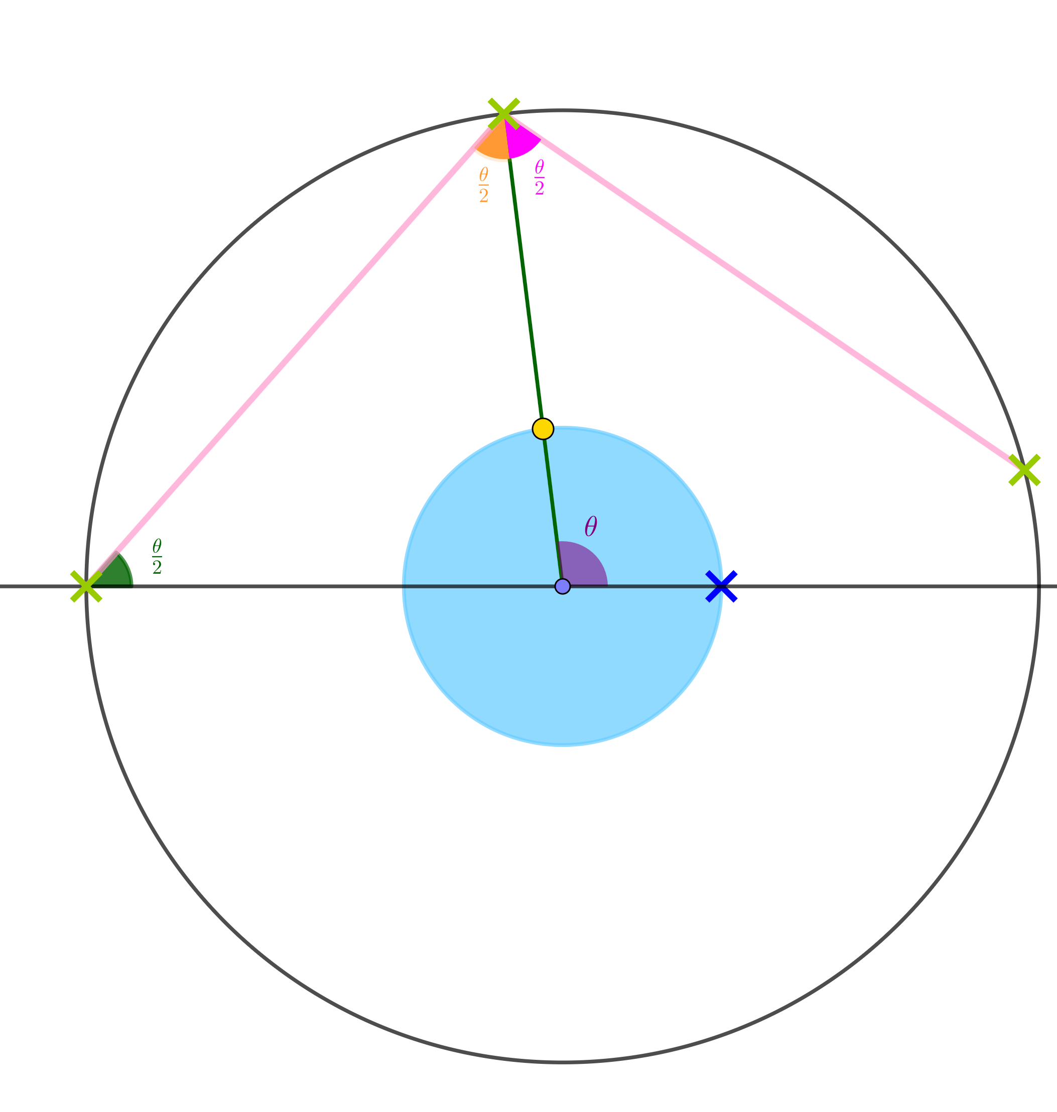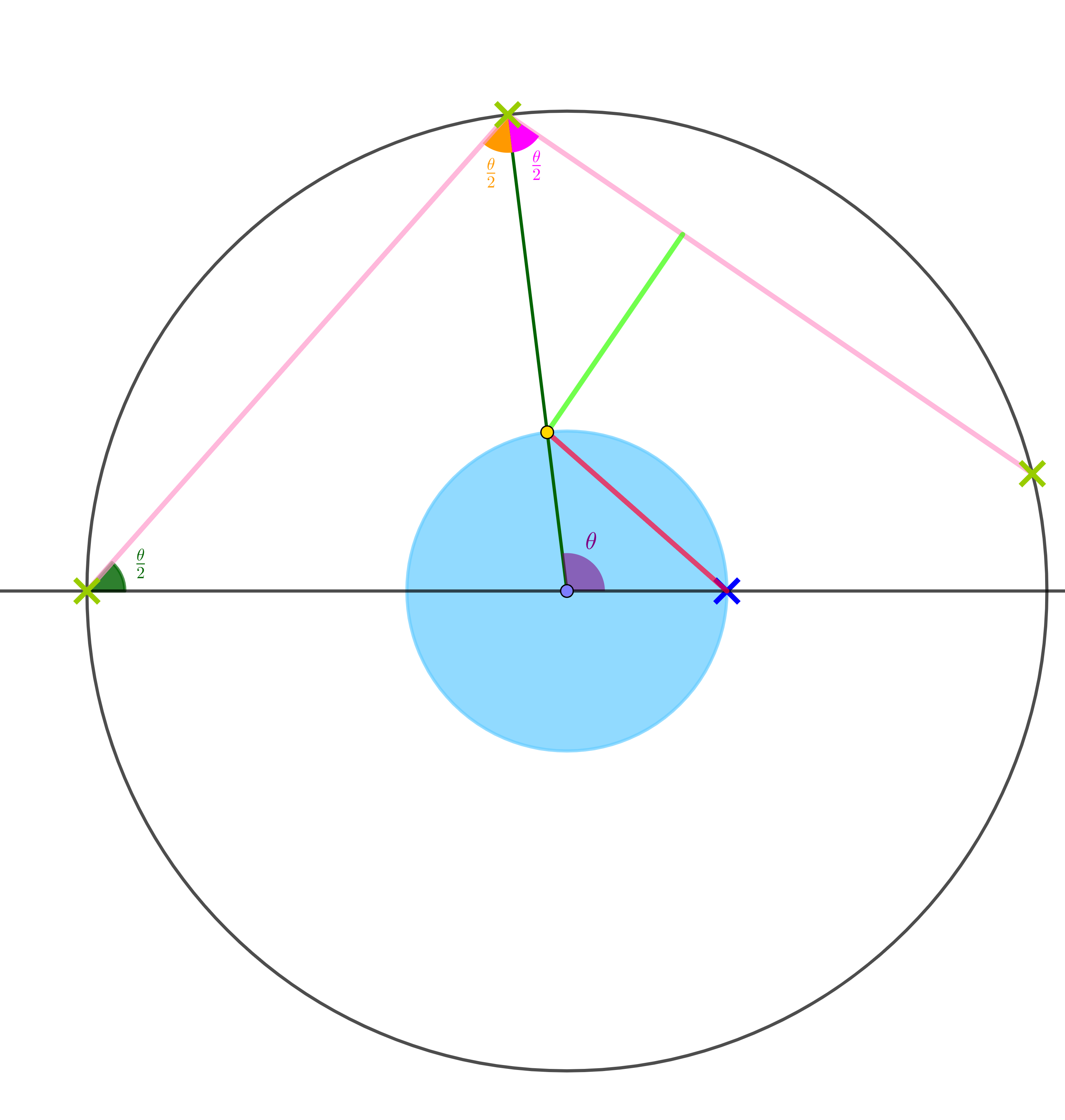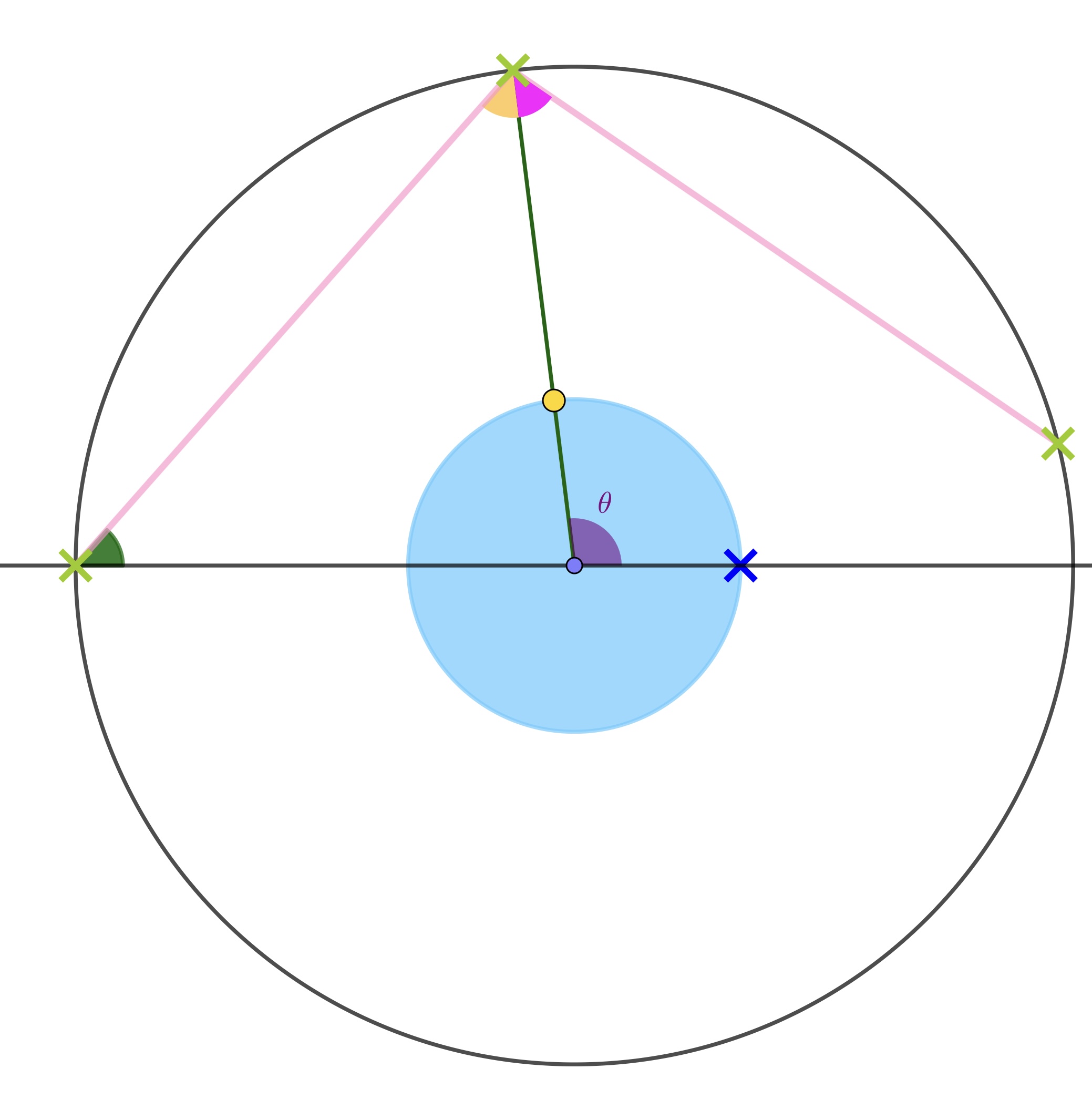If the two pink line segments are reflections of each other on the inside of the circle, what are the shaded angles?